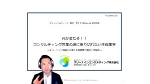 募集は終了しました 2022.8.10(水) 17:00-18:00 【オフィシャルパートナー限定】8月のオンライン定例研修 「第22回 何か変だぞ!コンサルティング営業の波に乗り切れない生保業界 ~スリーナイン目線から見た生保業界の現状と可能性~」 講師:青山 誠 氏 詳細はこちら