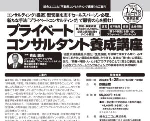 募集は終了しました 2022.10.13(木) 14:00-16:00 プライベートコンサルタント養成講座プレセミナー(全2講座) これからの時代に生き残る士業、コンサルタントのための 『プライベートコンサルタント養成講座』プレセミナー 講師:スリーナインコンサルティング株式会社代表取締役 プライベートコンサルタント 青山 誠 氏 詳細はこちら