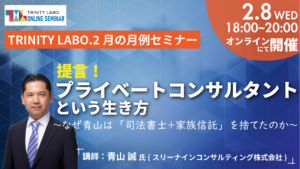 募集は終了しました 2023.02.08(水) 18:00-20:00 【敢えて司法書士を「捨てた」男のストーリー】手続き業務以外で報酬を確実に得る”プライベートコンサルタント”とは? スリーナインコンサルティング株式会社 青山 誠 氏 詳細はこちら