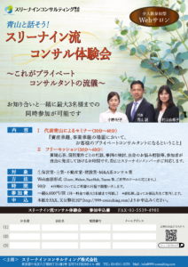 参加募集中 常時開催 少人数参加型Webサロン青山と話そう!スリーナイン流コンサル体験会〜これがプライベートコンサルタントの流儀〜 ご希望に応じて応相談、Webにて開催 講師:青山 誠 氏 他 詳細はこちら