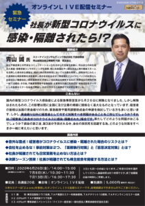 募集は終了しました 2020年4月25日(土)2020年6月26日(金)2020年7月8日(水)2020年7月13日(月) 社長が新型コロナウイルスに感染・隔離されたら?! 本セミナーは、「Zoom」を使用した「オンラインLIVEセミナー」です。 ご参加される媒体により操作方法が異なりますので下記をご確認ください。 講師:青山 誠 氏 詳細はこちら
