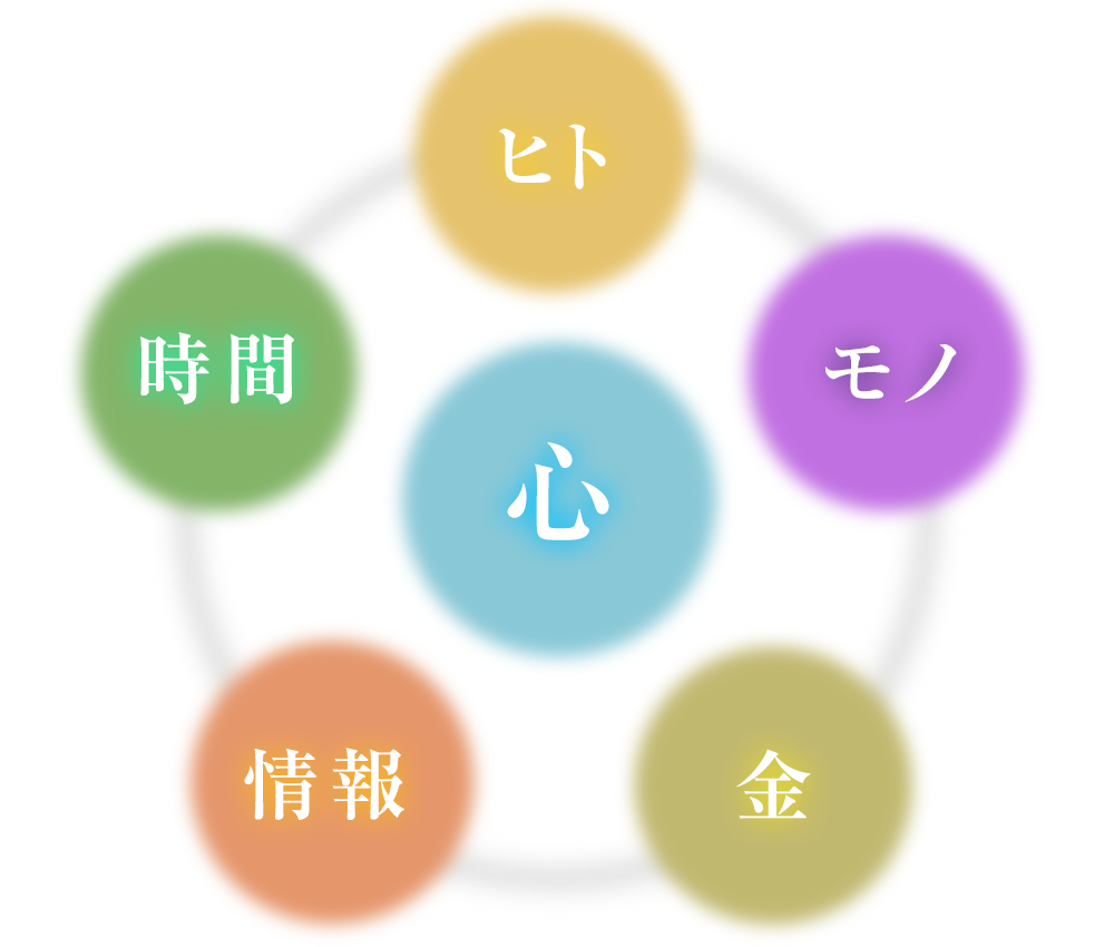 私たちは、お客様の人生を6つの要素(心・ヒト・時間・情報・金・モノ)で捉えます。